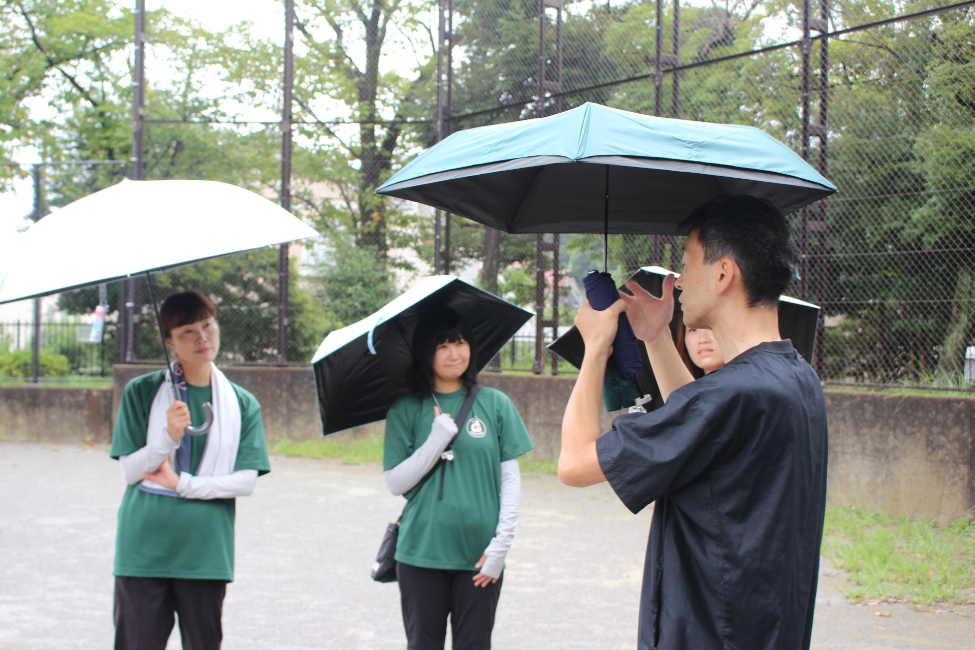 曇り空の中でしたが、説明時には日差しが差し込み、日傘の効果を体感。さらに小雨も降り、晴雨兼用の強みを同時に感じていただけました。